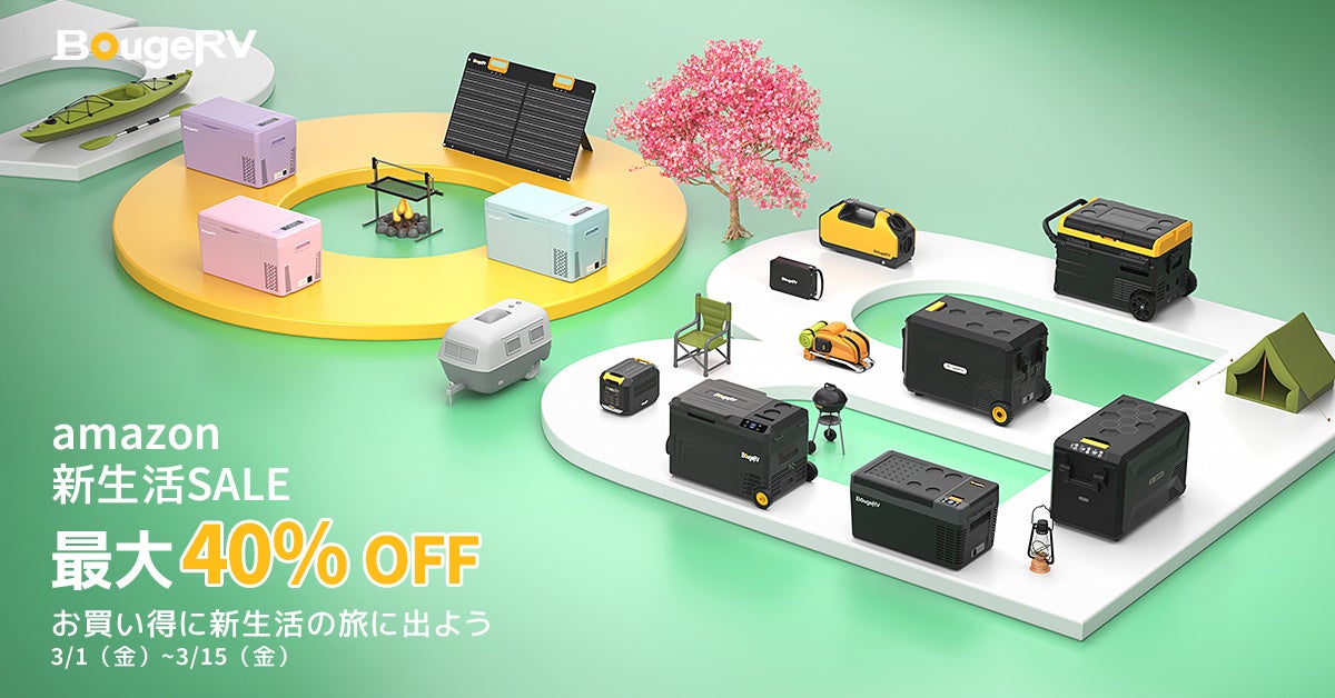 最大40%オフ!Amazon 新生活SALEが3月1日(金)9時から開催 BougeRVの人気ポータブル冷蔵庫、ポータブル電源、ソーラーパネルがお得に!