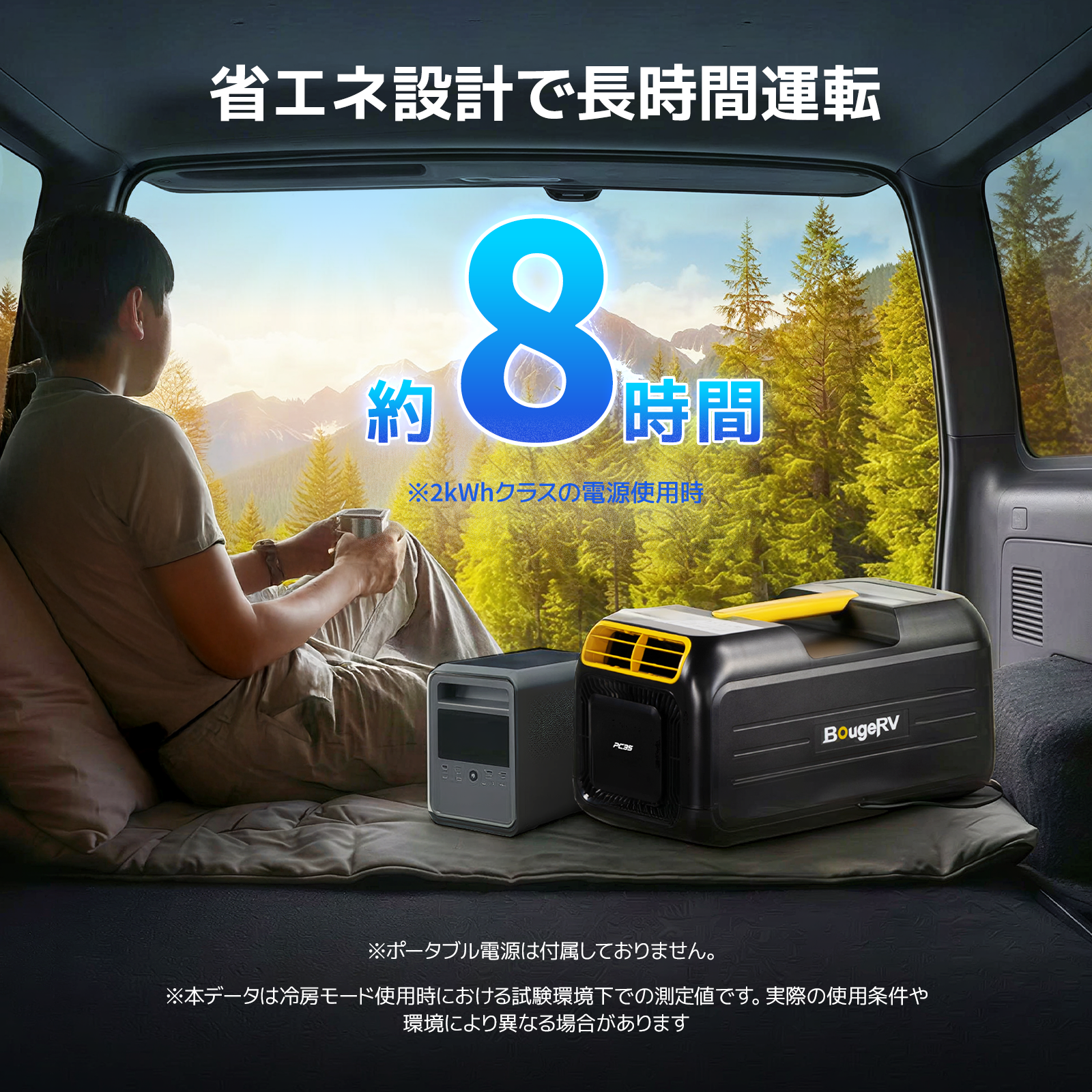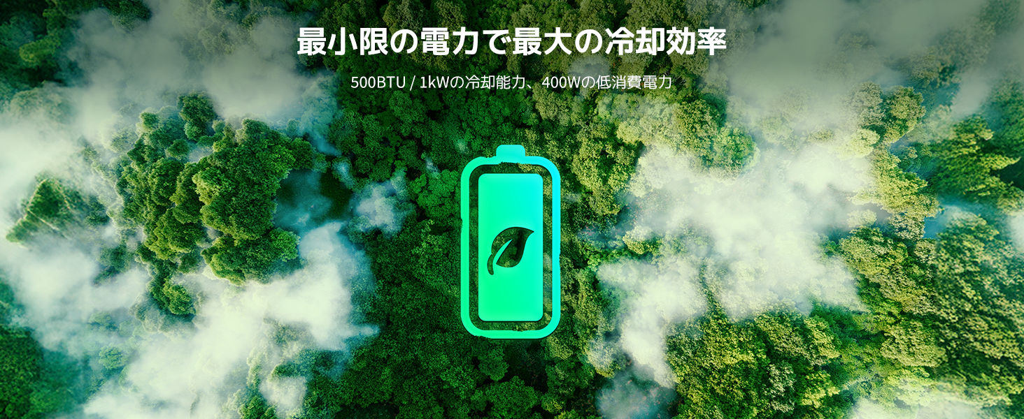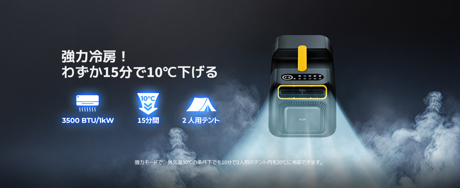 冷房能力3500BTUを誇り、2人用テントの空間をわずか15分で10°Cも低下させます。※この結果はテスト環境下(6㎡、30°Cから20°Cに低下)でのものです。実際の使用環境や条件によって異なる場合があります。