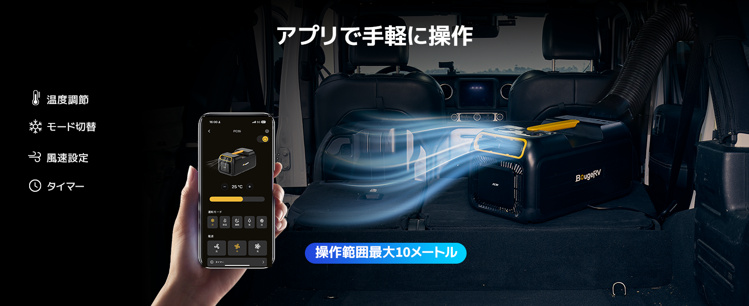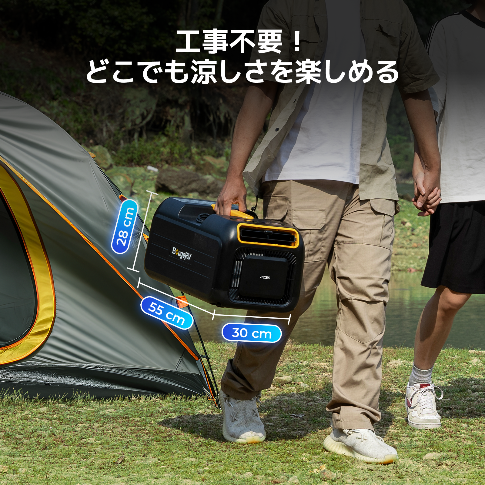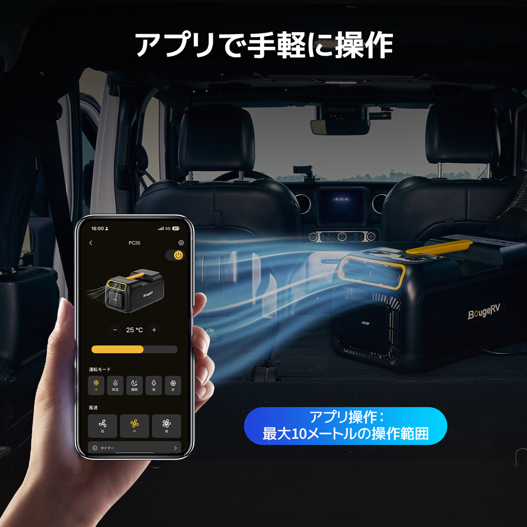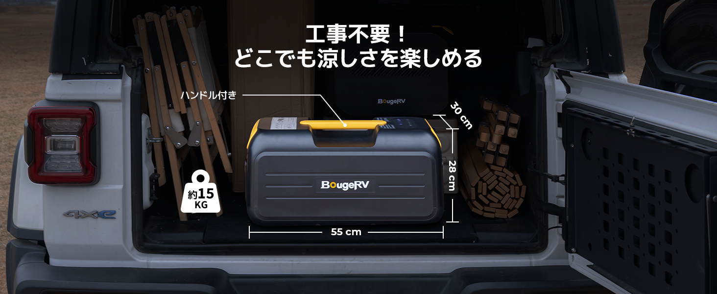 コンパクトなデザインで、車内やテント内でも場所を取りません。片手で簡単に持ち運びができ、工事不要なので設置が簡単です。いつでもどこでも簡単に冷房を開始でき、涼しさを楽しむことができます。