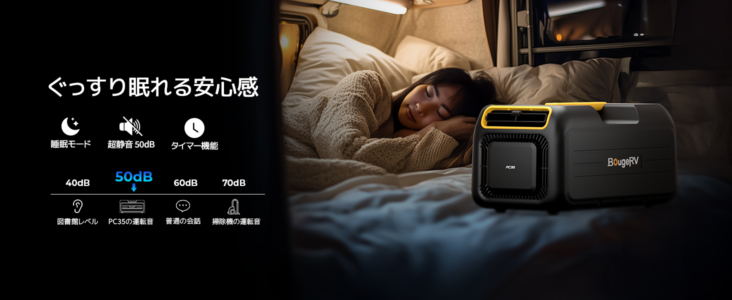 静かな睡眠モードでは運転音が50db以下。夜間でも安眠を妨げません。