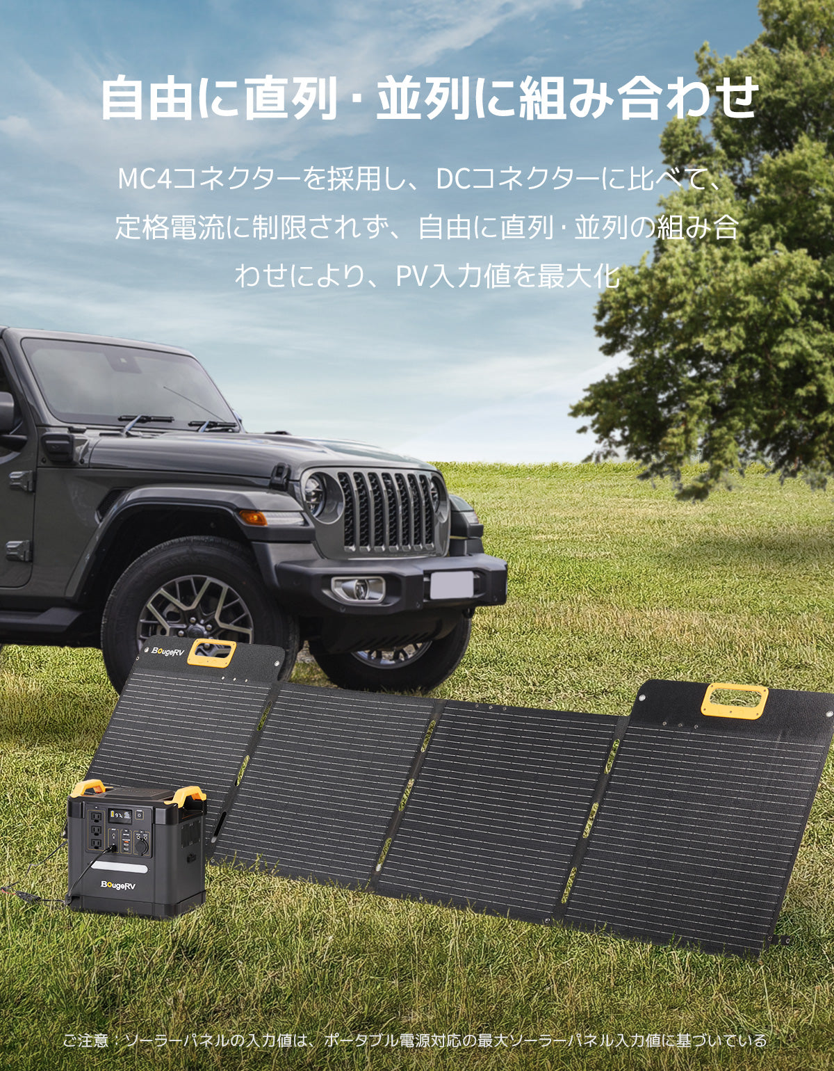 BougeRV 200W 小型ソーラーパネルチャージャーはMC4出力ポートを採用して、通常のDCポートより2倍以上の電力を出力できる、ソーラーパネルを数枚で並列可能、大容量のポータブル電源にも適用!また、陰影が出力に与える影響を低減するため、9BB電池セル(23%高交換効率)を採用し、通常の5BBセルの太陽光パネル(15%)の発電効果より倍以上向上し、耐高温性にも強くなり、暑い夏でも焼損の心配がない。BougeRVの太陽光発電パネルは、キャンプやハイキングなどのアウトドアで快適に電源を供給するだけでなく、自然災害による停電の際にも、いつでもどこでも自由に充電できる!
