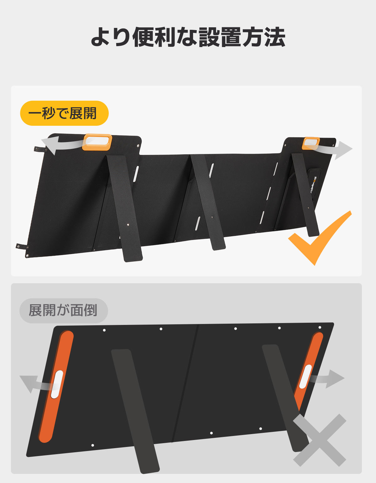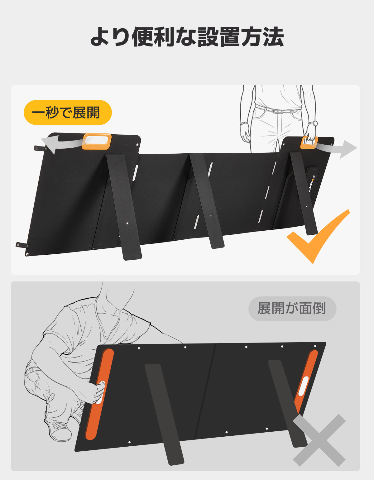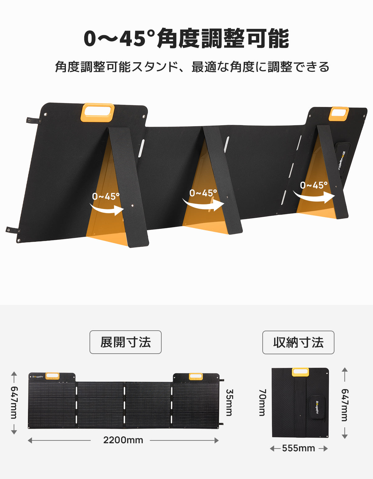 ソーラーパネルの背面には、0°〜45°まで調整可能なスタンドがあり、太陽光の照射角度に応じて柔軟に調整することができ、より効率的な光エネルギー変換を実現できます。