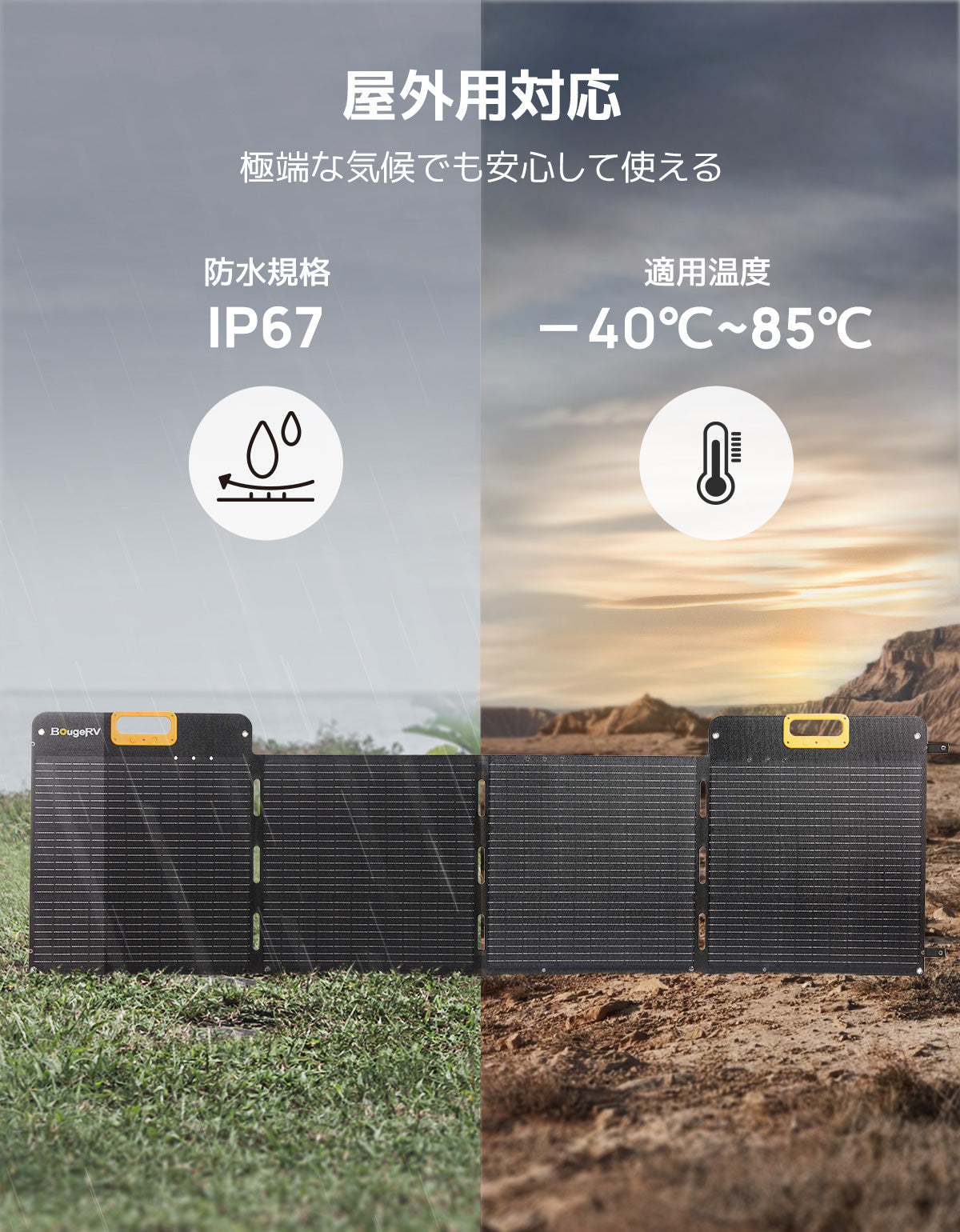 BougeRVの太陽光パネルは、IP67の防水等級を持ち、-40℃〜85℃での使用に適しており、屋外での使用に非常に適しています。湿気や雨などの影響からパネルを効果的に保護し、長持ちさせることができます。さらに、IP67は防塵等級も持っており、砂やほこりからパネルを保護することができます。キャンプや釣り、ボートなどの湿った場所での使用に適しています。