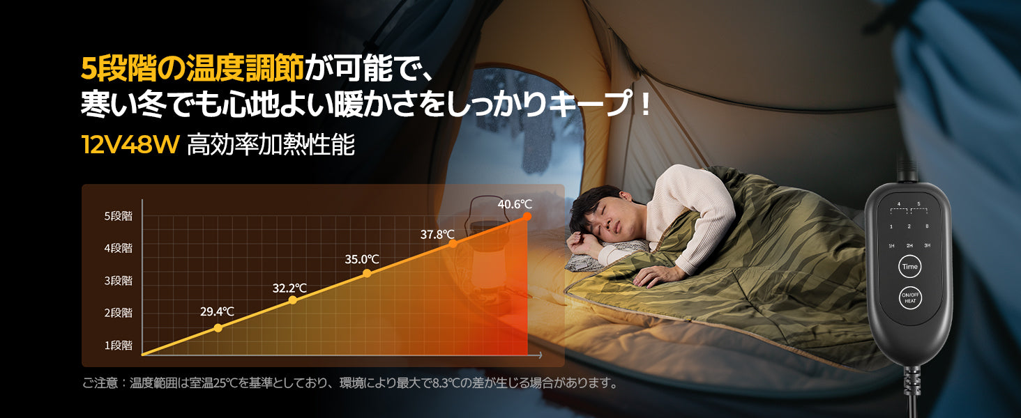 12V 48Wの効率的な加熱技術を採用。スイッチを入れると、数秒で温度が上昇し、冷えた体を優しく温めます。さらに、1~5段階の温度調節が可能で、周囲の温度やお好みに合わせて細かく調整できるため、寒い冬の日でも心地よい暖かさをお楽しみいただけます。
