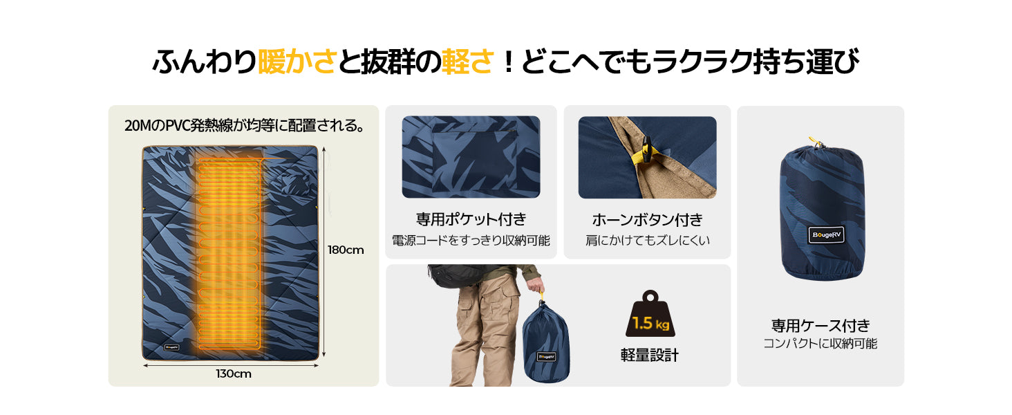 BougeRV 12V電気毛布│コンパクト・軽量・20時間連続使用可能 (ブルー)
