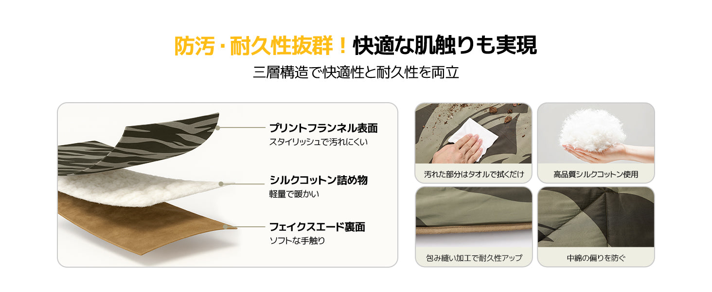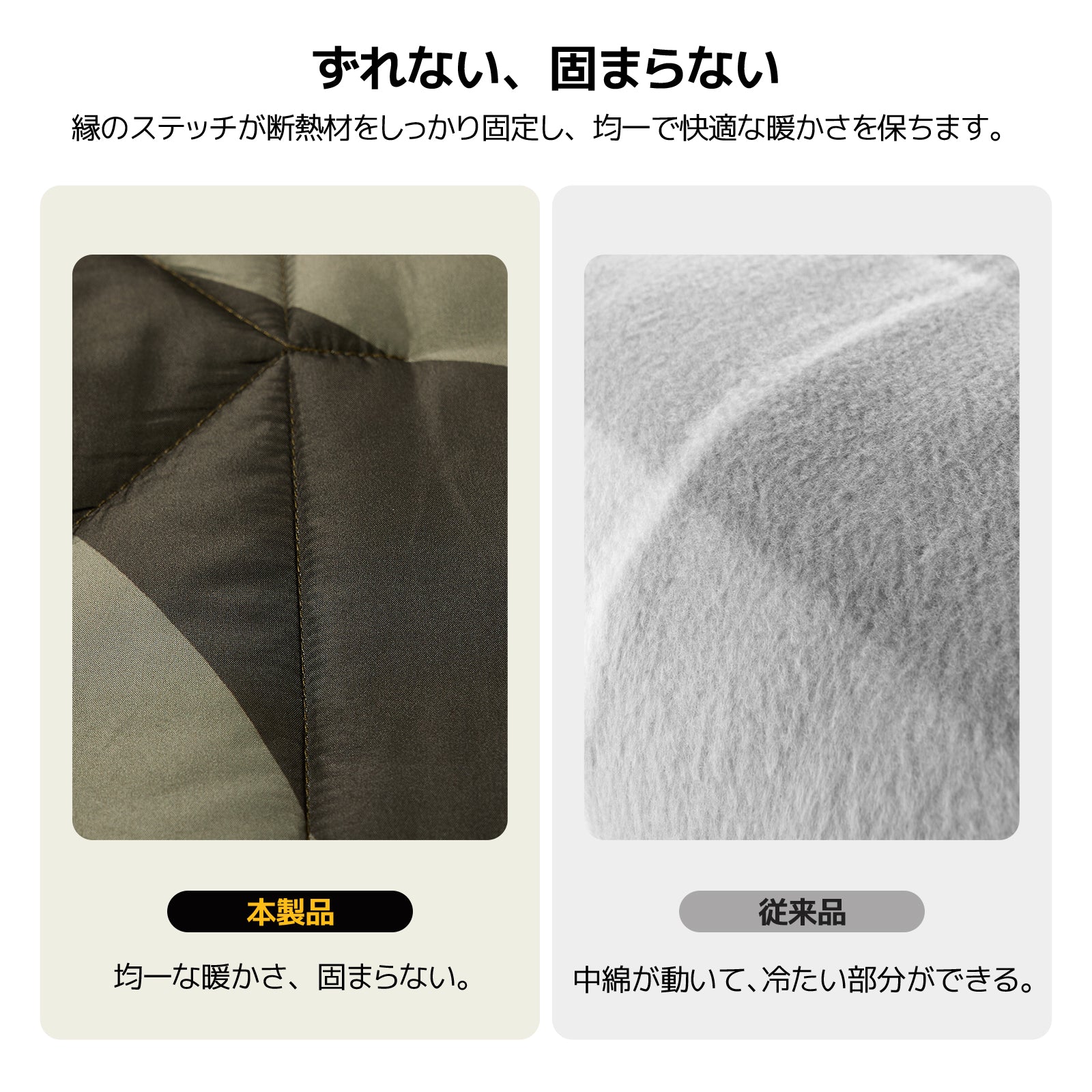 外側は独特な山岳デザインの生地を採用し、自然の雰囲気を演出。中間層には保温性に優れたシルクコットンを使用し、暖かさをキープ。内側には柔らかく肌に優しいフェイクファーを使用しており、滑らかな触り心地で肌にしっかり寄り添います。