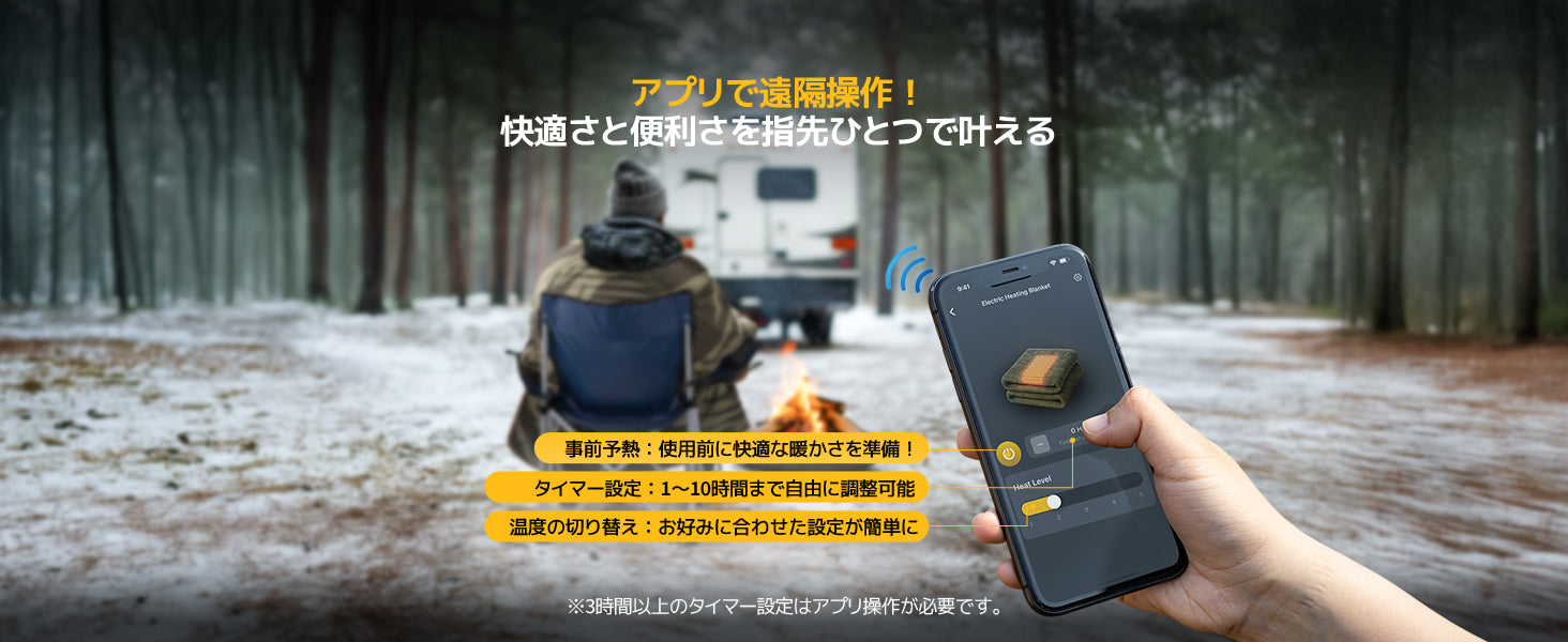BougeRV公式アプリに対応しており、加熱モードやタイマー機能を簡単に遠隔操作できます。また、使用前に事前加熱を設定することで、寒い日でもスイッチを入れた瞬間から快適な暖かさを楽しむことができます。タイマーは1~10時間まで設定可能で、未設定時は3時間後に自動オフとなる省エネ設計です。