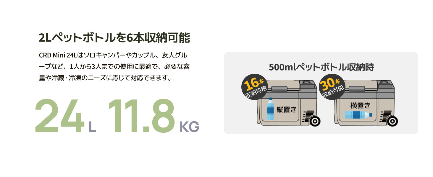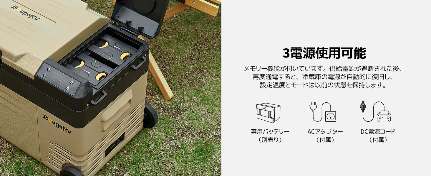 2個の専用バッテリーを内蔵することができます(バッテリーは別売り)。バッテリーを利用して給電すれば、エンジンが切れている状態でも冷蔵庫を正常に動作させることができます。これにより、車中泊、キャンプ、バーベキュー、釣り、買い物などアウトドア活動時に非常に便利です。