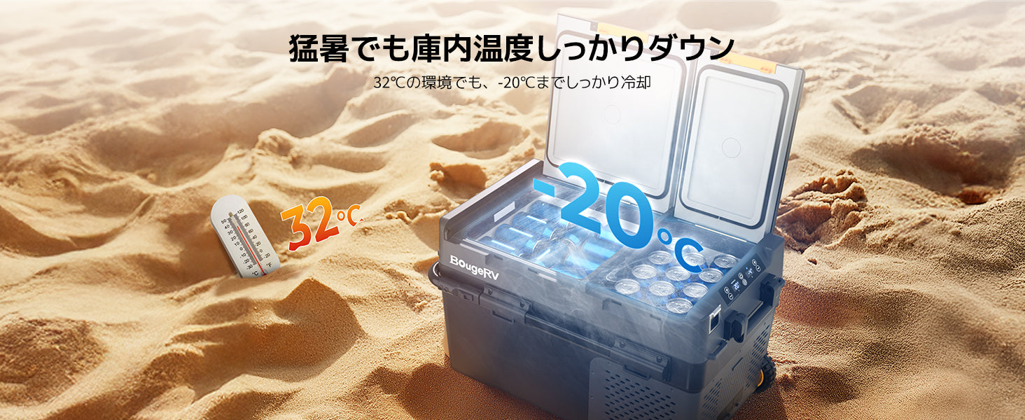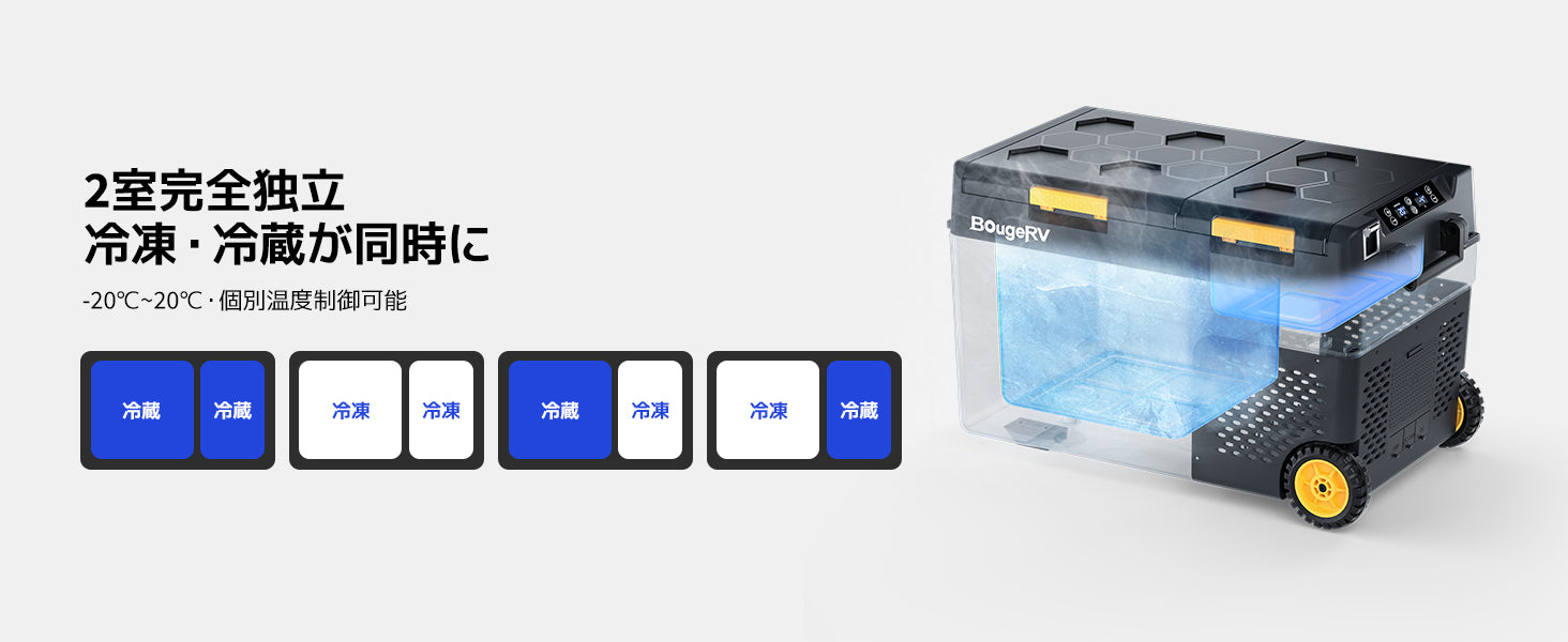 -20℃~20℃の広域温度調節が可能な2室設計。飲み物の急速冷却とアイスクリームの冷凍保存を同時に実現します。車中泊の朝には冷えた牛乳でコーヒーを、夜には凍ったビールを楽しめる多用途性が魅力です。