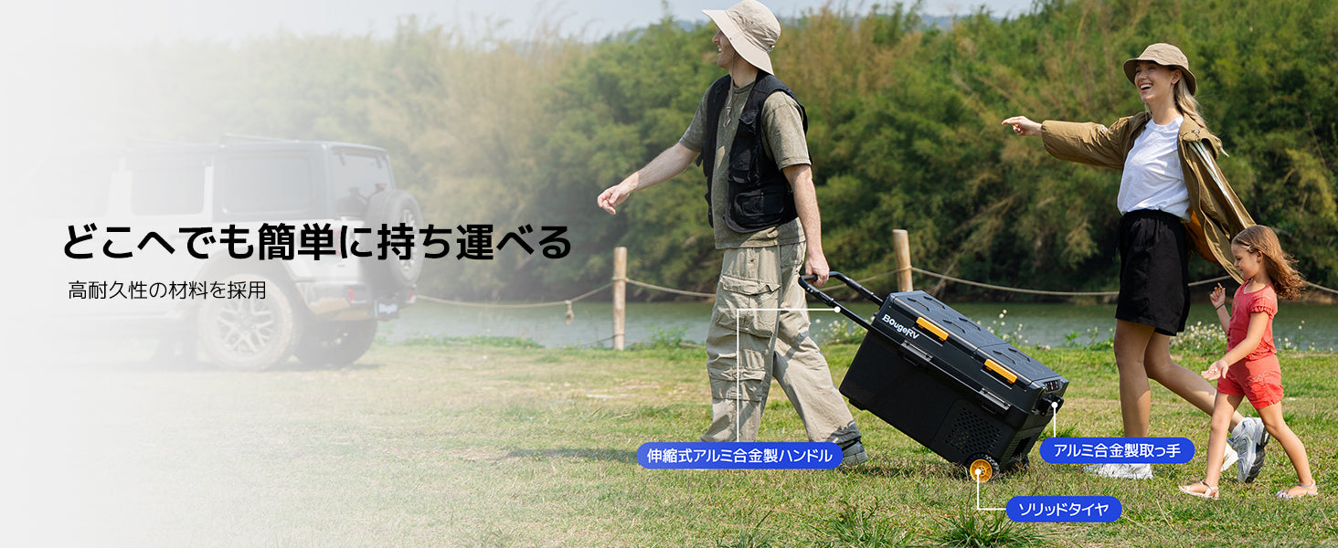 専用アプリで温度管理や電力監視が可能(±1℃精度で表示)。また、大型キャスターと伸縮ハンドルを装備しており、段差を越える際もスムーズ。