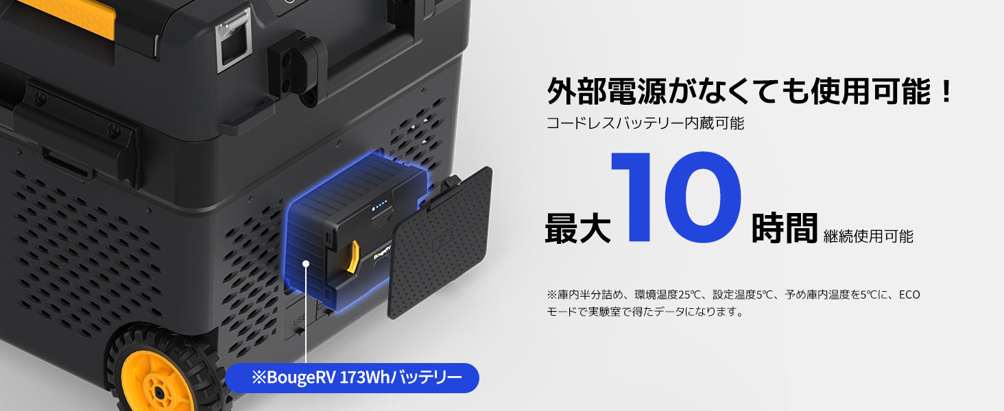 173Wh専用バッテリー(別売り)を内蔵して、最長8.5時間の連続稼働が可能です。アウトドアやキャンプ、旅行、そして停電時にも大活躍!