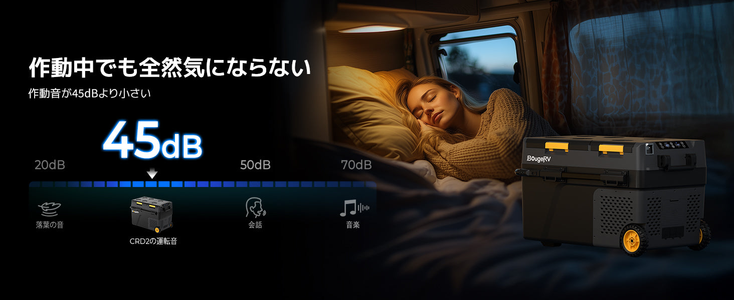 運転音はわずか45dBの静音設計を採用。車内やキャンプ場、夜間の車中泊でも音が気にならず、快適に過ごせます。特に長時間使用する場合でも、静かでストレスフリーな環境を提供します。