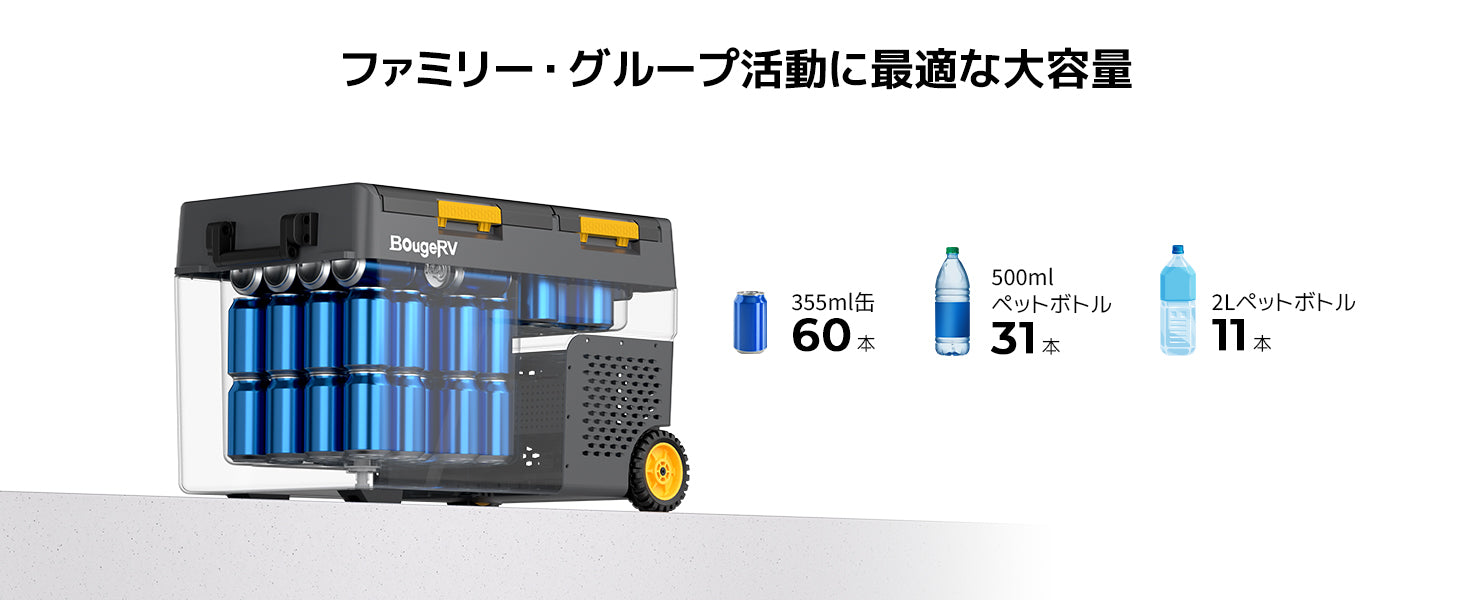 40Lモデル(外寸:729×461×438mm):355ml缶60本、500mlペットボトル15本、2Lペットボトル11本を収納可能。コンパクトながら十分な容量で、少人数の旅行や日帰りキャンプに最適です。