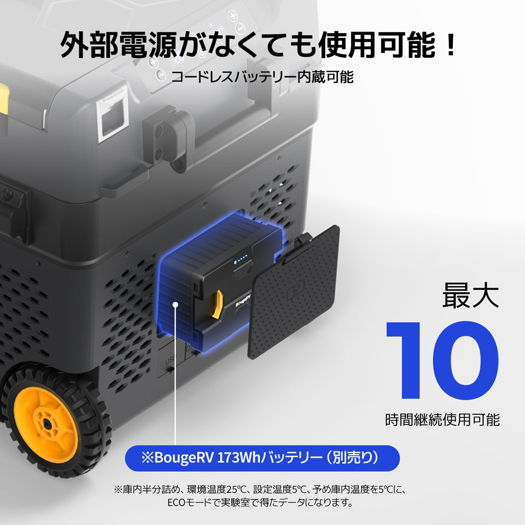 173Wh専用バッテリー(別売り)を内蔵して、最長8.5時間の連続稼働が可能です。アウトドアやキャンプ、旅行、そして停電時にも大活躍!
