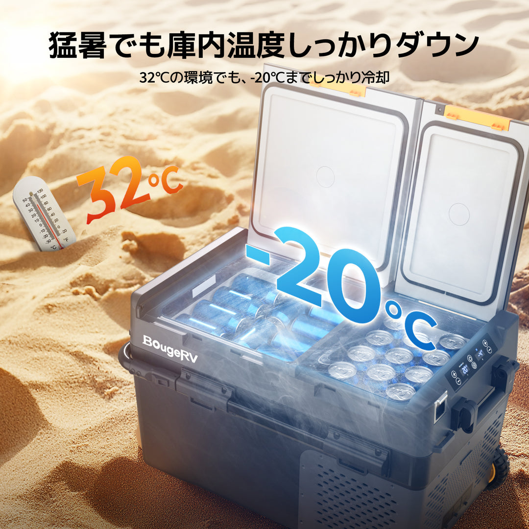 -20℃~20℃の広域温度調節が可能な2室設計。飲み物の急速冷却とアイスクリームの冷凍保存を同時に実現します。車中泊の朝には冷えた牛乳でコーヒーを、夜には凍ったビールを楽しめる多用途性が魅力です。