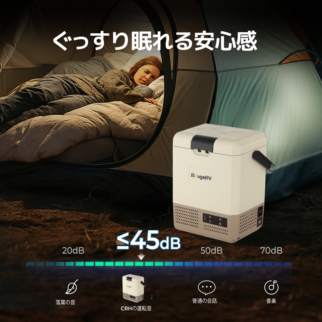 -20℃~20℃までの温度調整が可能。32℃の環境下でも20分で0℃まで冷却。動作音は45dB以下で、夜間や車中泊でも快適に使用できます。高性能かつ静かな冷蔵庫です。