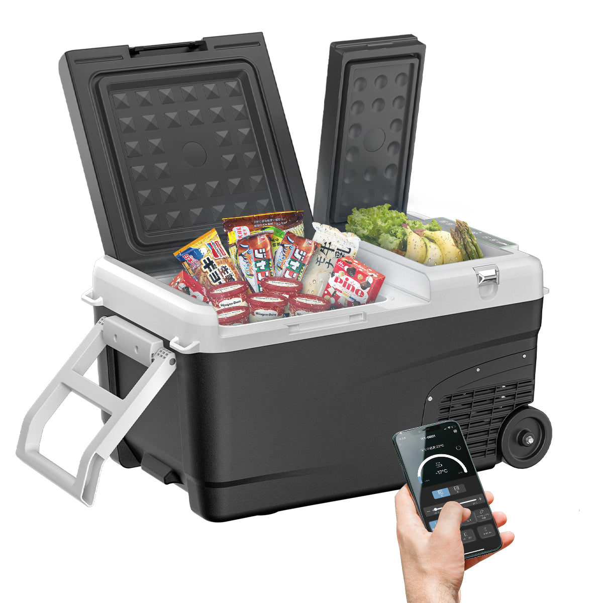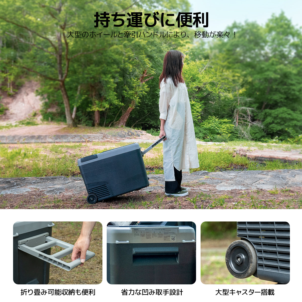 ①アプリで温度やモード等を設定でき、約10ⅿから離れても操作できるので、移動の手間を省きます②30°耐震補強設計 :不安定な場所でも安心して使用できます。 ③優れた放熱性能**:効率的な冷却を長時間維持。 ④折りたたみ可能なハンドルと大型キャスター付き:移動が簡単で便利。 ⑤左右に取り付け可能なフック:冷蔵庫をしっかりと固定。 ⑥内蔵LCDライト:暗い場所でも中身が見やすい。 ⑦コップスロットが付:屋外でテーブルやカップホルダーとして使用できます。 ⑧栓抜き付き:アウトドアでもすぐに使える便利アイテム。