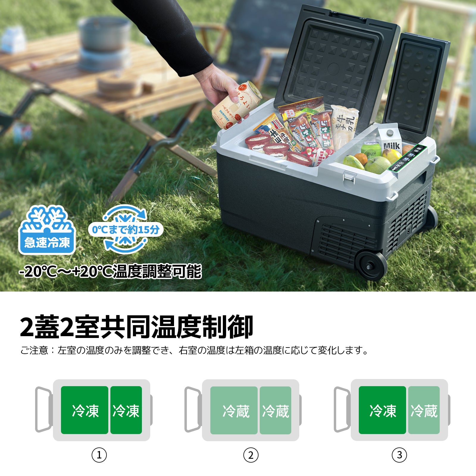 2蓋2室で共同温度制御が可能、-20℃~+20℃まで調整でき、左右の室はそれぞれ冷凍室と冷蔵室として使えます。保存する物の管理温度によって使い分けられるため、2つの蓋で異なる部屋の味が混ざることを防ぐことができます。実用性が向上します!ご注意:①左室の温度のみを調整でき、右室の温度は左箱の温度に応じて変化します。②左室の温度を-20度に設定する場合、右室の温度は0度で;左室の温度を-18度に設定する場合、右室の温度は2度になります