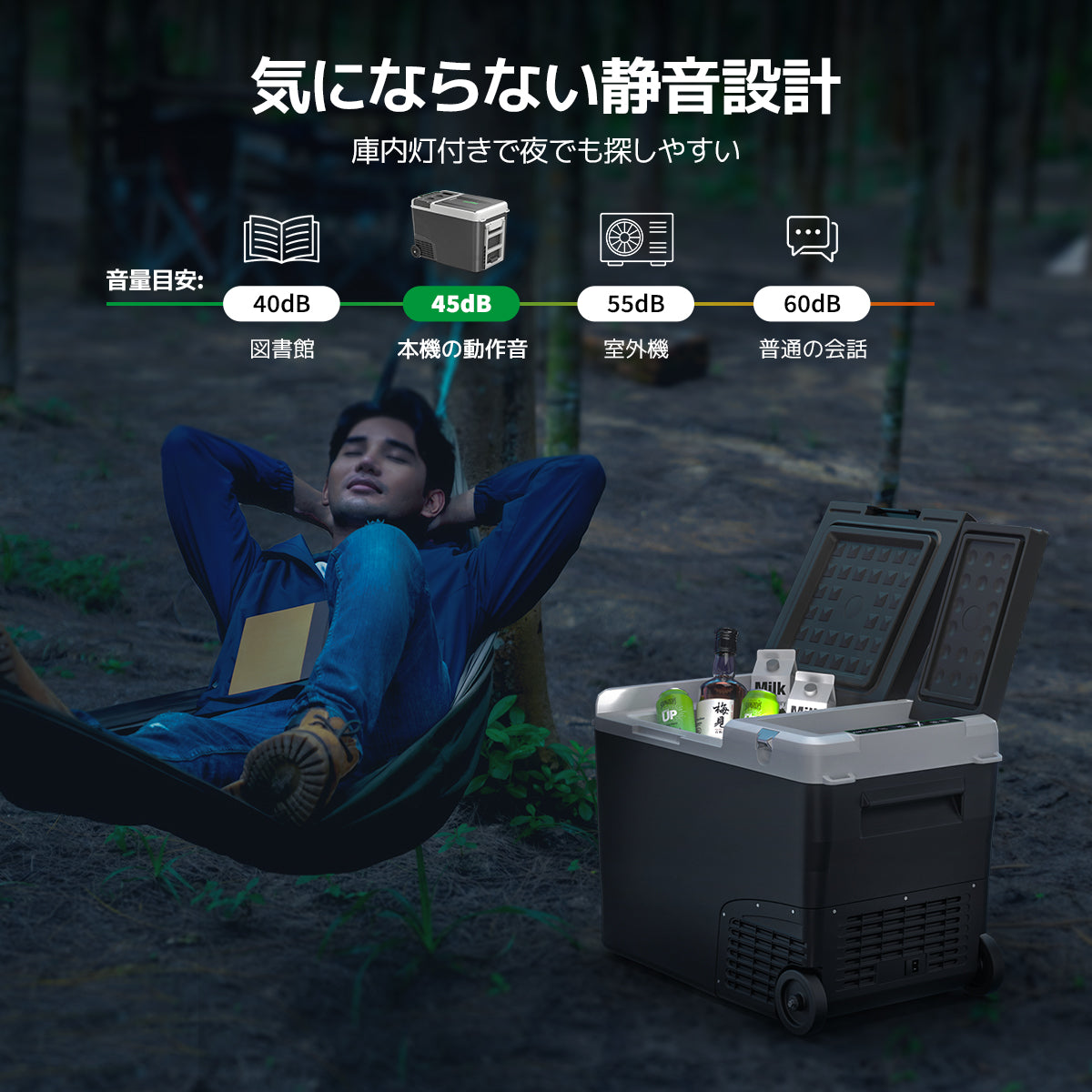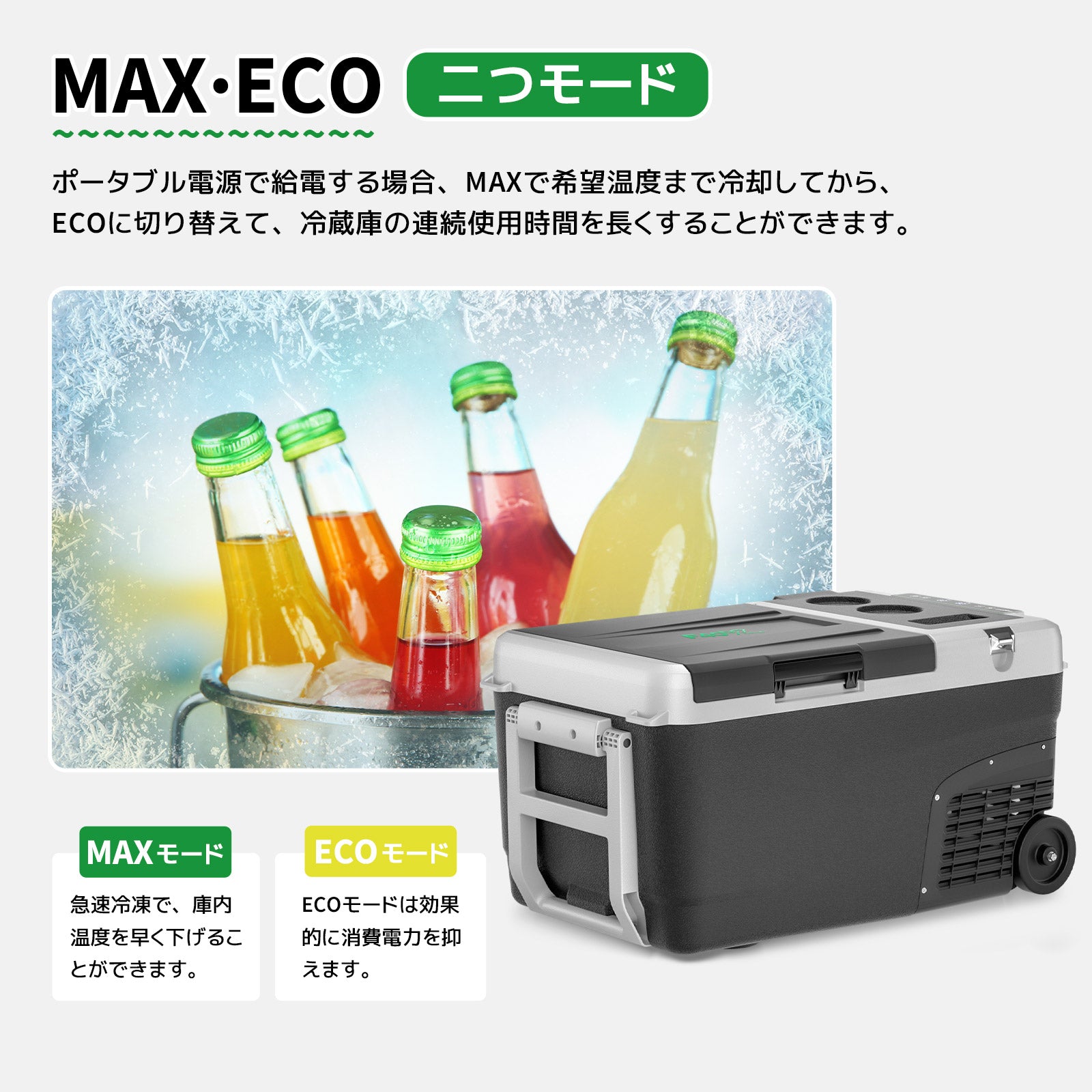 車載冷蔵庫はMaxモード(約60W)とEcoモード((約48W))の二種類の冷却モードを搭載。まずMaxモードを使用して急速に冷却し、その後Ecoモードに切り替えることで、効率的に電力を節約できます。運転音はたった45dBで、ほぼ無音と言える静かさです。車中泊や寝室に置いでも安心して快適な睡眠をサポートします。