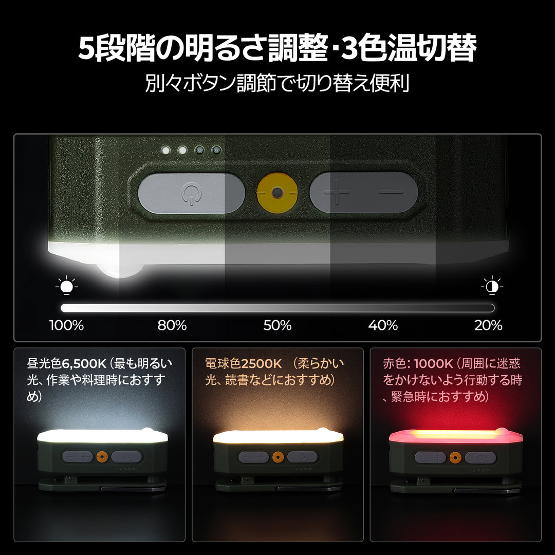 調光モード、色温切り替え(6500K/2500K/1000K)、SOSモードなど多彩な点灯モードが搭載されているため、様々な用途やシーンに合わせた最適な照明を選ぶことができる。