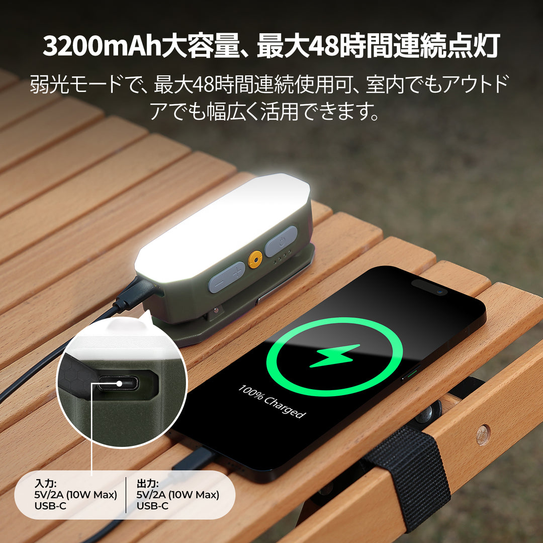 3200mAhの大容量バッテリーにより、弱光モードなら長時間連続使用可能。長時間使用できる充電式ランタンとして、防災時や夜間の活動中にも安心して使用でき、安全を守る。