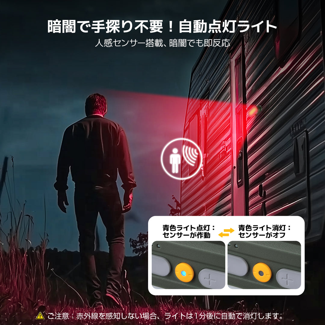 屋外センサーライト機能付きで、手をかざすだけで簡単に点灯・消灯が可能。夜間の使用時にストレスフリーな操作性を提供し、利便性を最大限に引き出す。