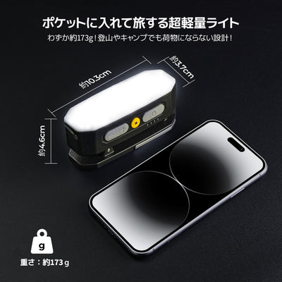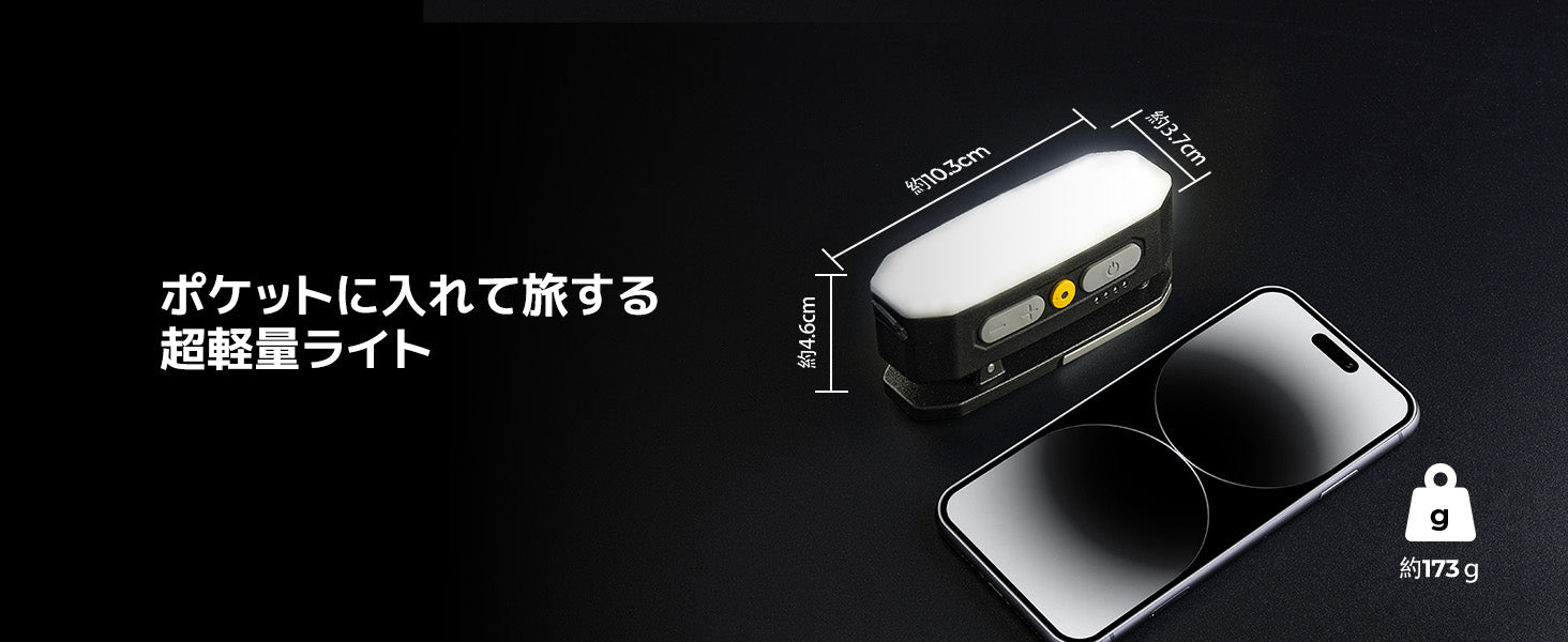 たった200gのミニマライトは、スマートフォンとほぼ同じ重さ。103×39×50mmのコンパクトサイズで、ポケットやバッグにすっぽり収まります。キャンプや旅行、防災時にも手軽に持ち運べて、いつでもどこでもストレスフリーに使用可能です。
