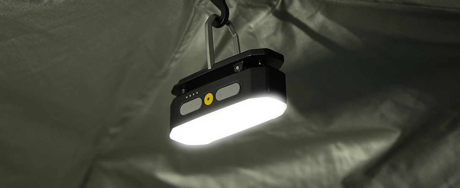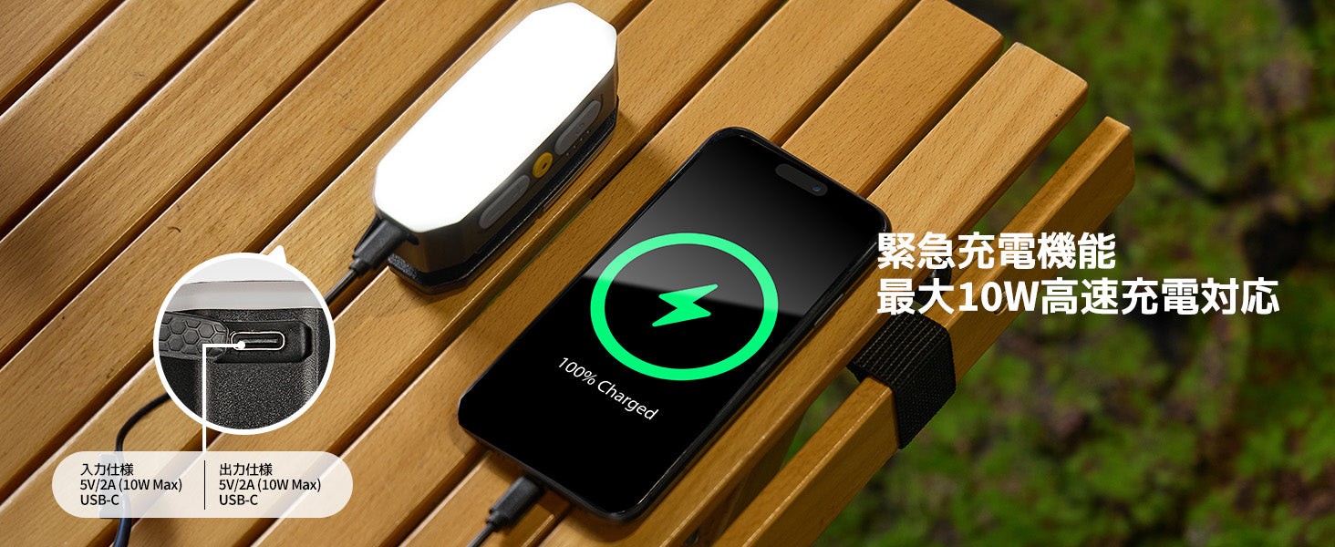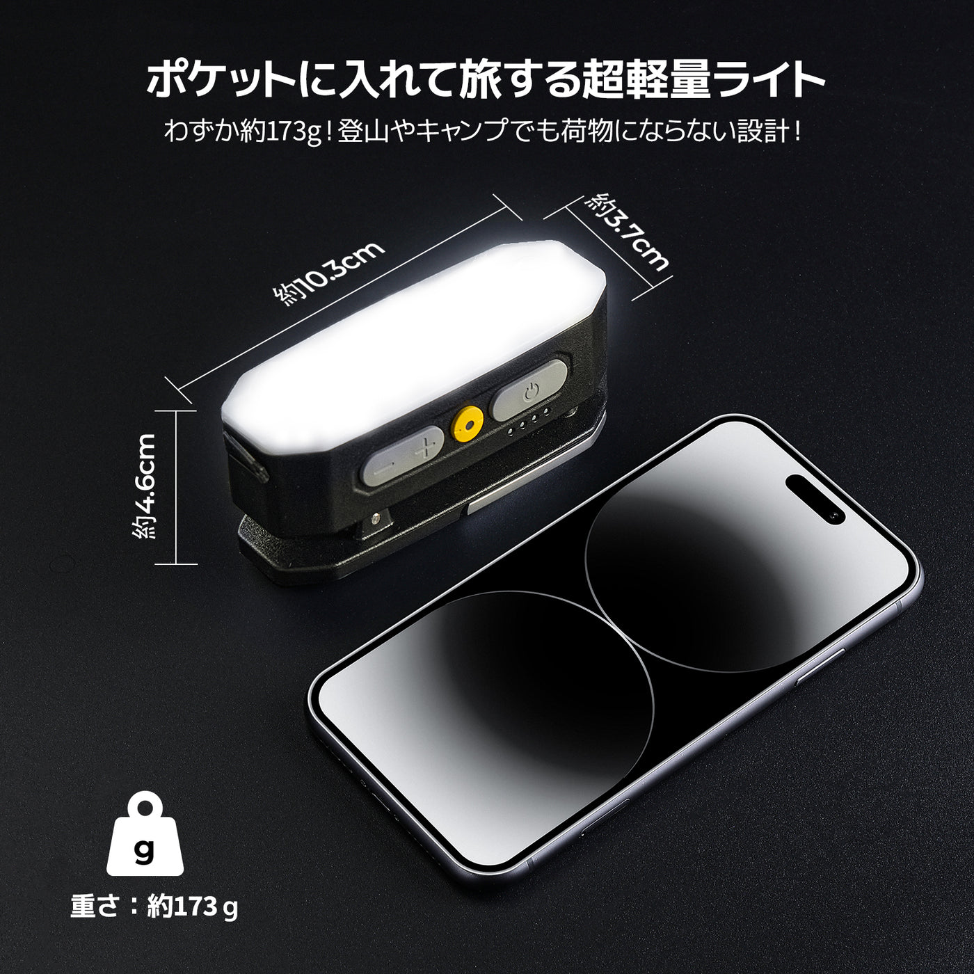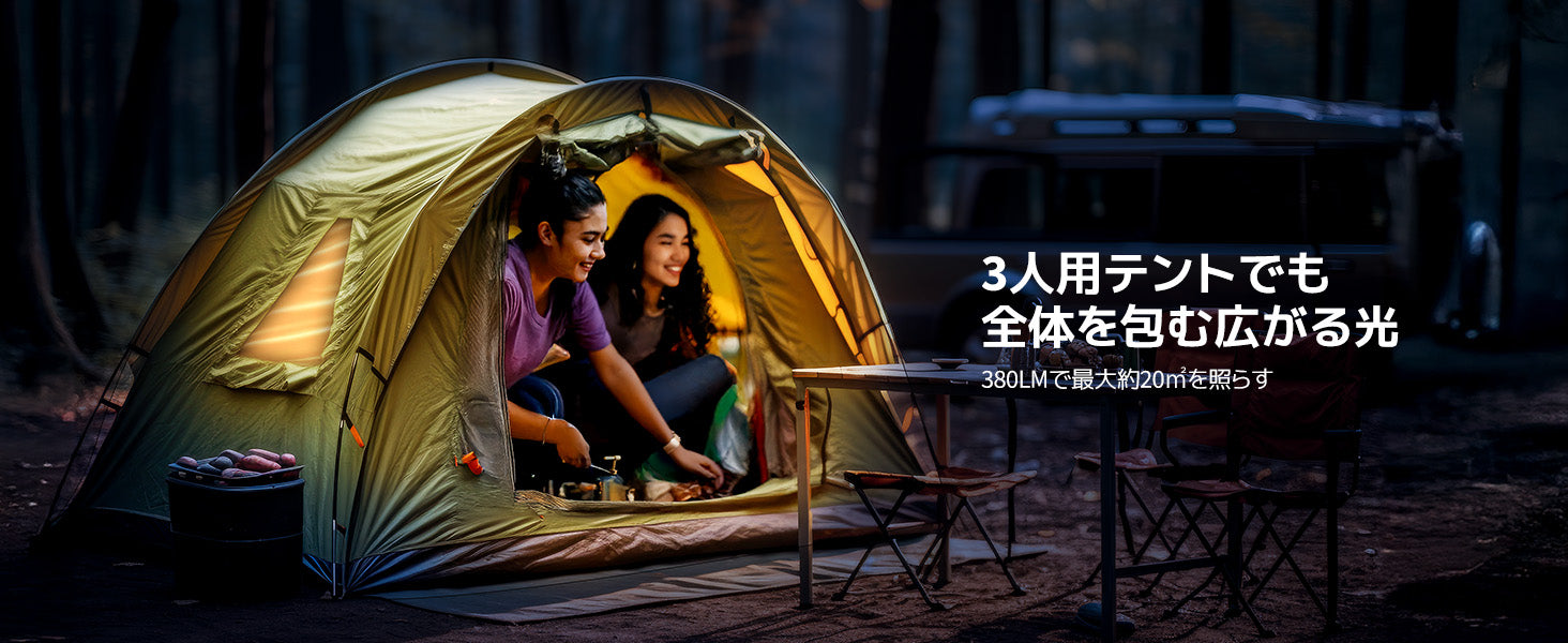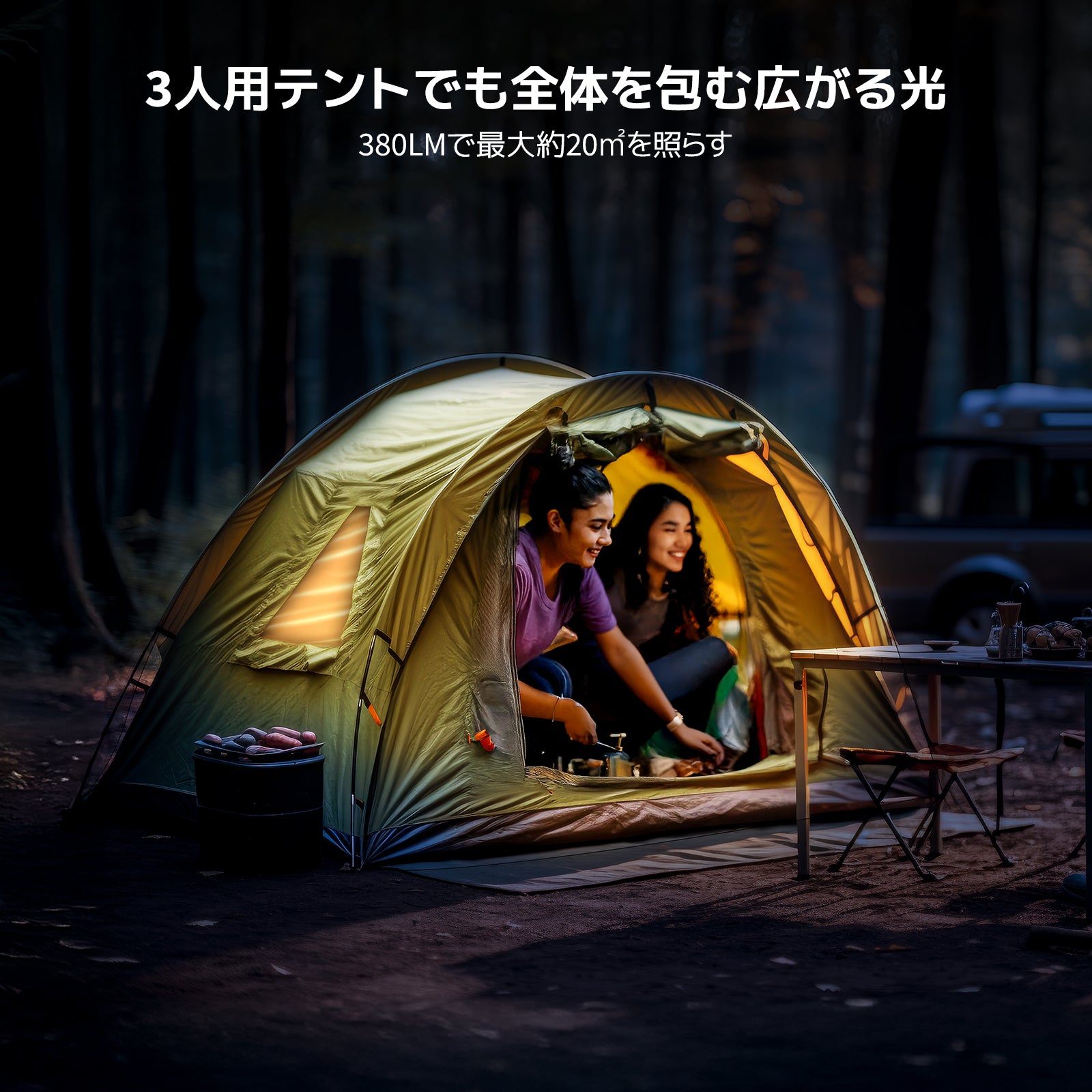 380lm/20㎡照射可能。2-3人用テント対応。USB-C充給電&緊急充電器化。SOSモード搭載!